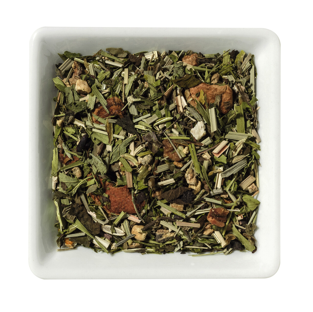 Składniki: Słodki koper włoski*, kawałki jabłka*, trawa cytrynowa* (13%), imbir*,skórki cytrusowe*, melisa* (11%), trawa jęczmienna* (6%), słodkie liście jeżyny*, biały hibiskus*, nasiona konopi* (2%), olejek cytrusowy*, naturalny aromat trawy cytrynowej*